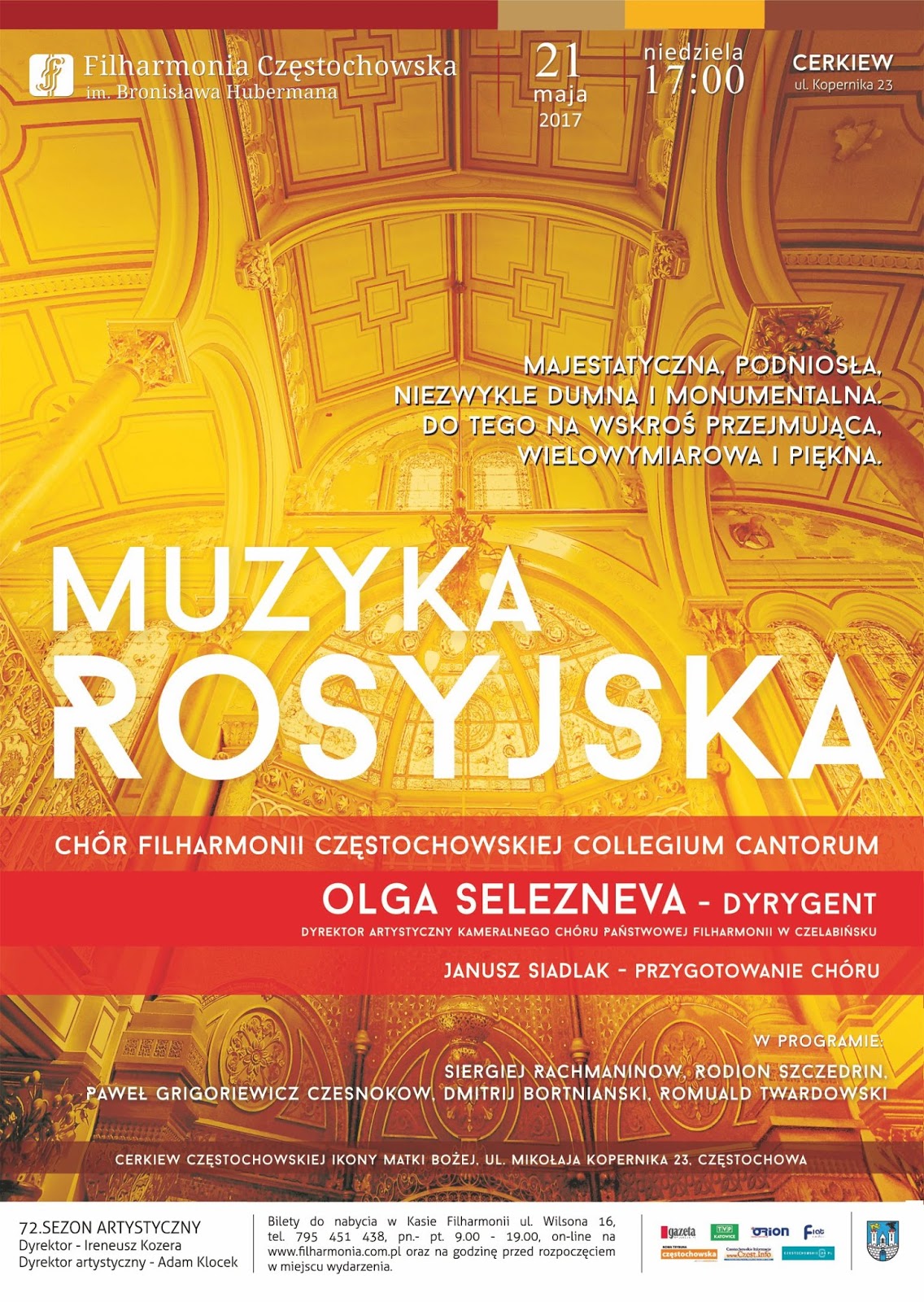 W maju będziemy mieli okazję wysłuchać przekroju rosyjskiej muzyki sakralnej, którą wybrała dla częstochowskiej publiczności Olga Selezniewa, uznana rosyjska dyrygentka, dyrektor artystyczny Kameralnego Chóru Państwowej Filharmonii w Czelabińsku. W programie koncertu znajdą się utwory kompozytorów takich jak: Siergiej Rachmaninow, Rodion Szczedrin, Paweł Grigoriewicz Czesnokow, Dmitrij Bortnianski, czy też czołowego polskiego twórcy muzyki cerkiewnej Romualda Twardowskiego.